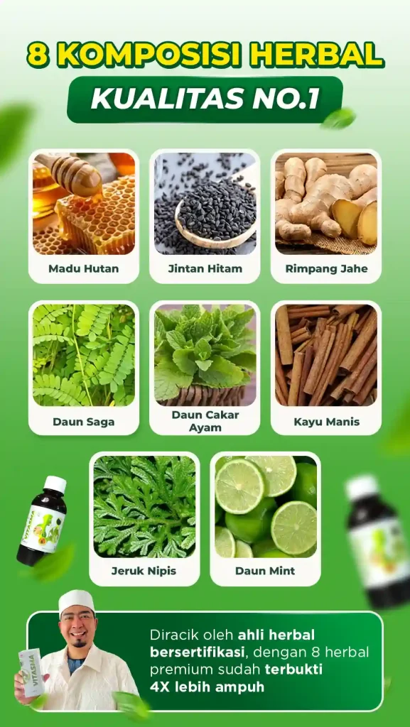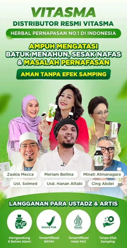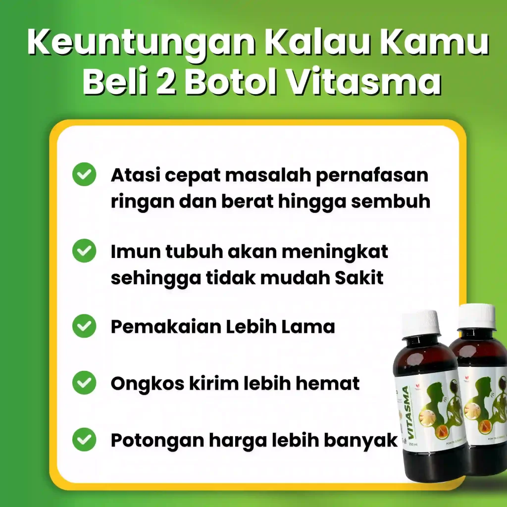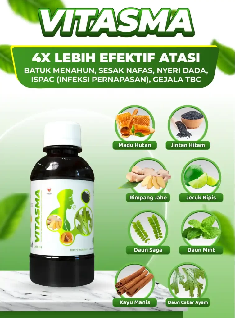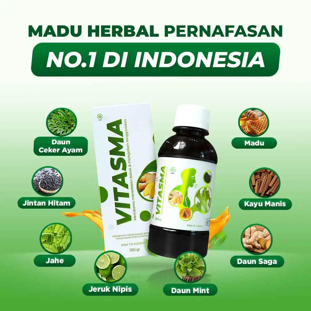 Madu vitasma, persembahan berkualitas dari bahan herbal alami pilihan kualitas premium yang kaya akan Antioksidan Aktif, Asam Fenolik, Fitonutrien & Flavonoid yang terbukti 4X Lebih Ampuh Mengatasi Batuk Menahun, Sesak Nafas, & Masalah Pernafasan lainnya secara alami, sehat dan tanpa efek samping.